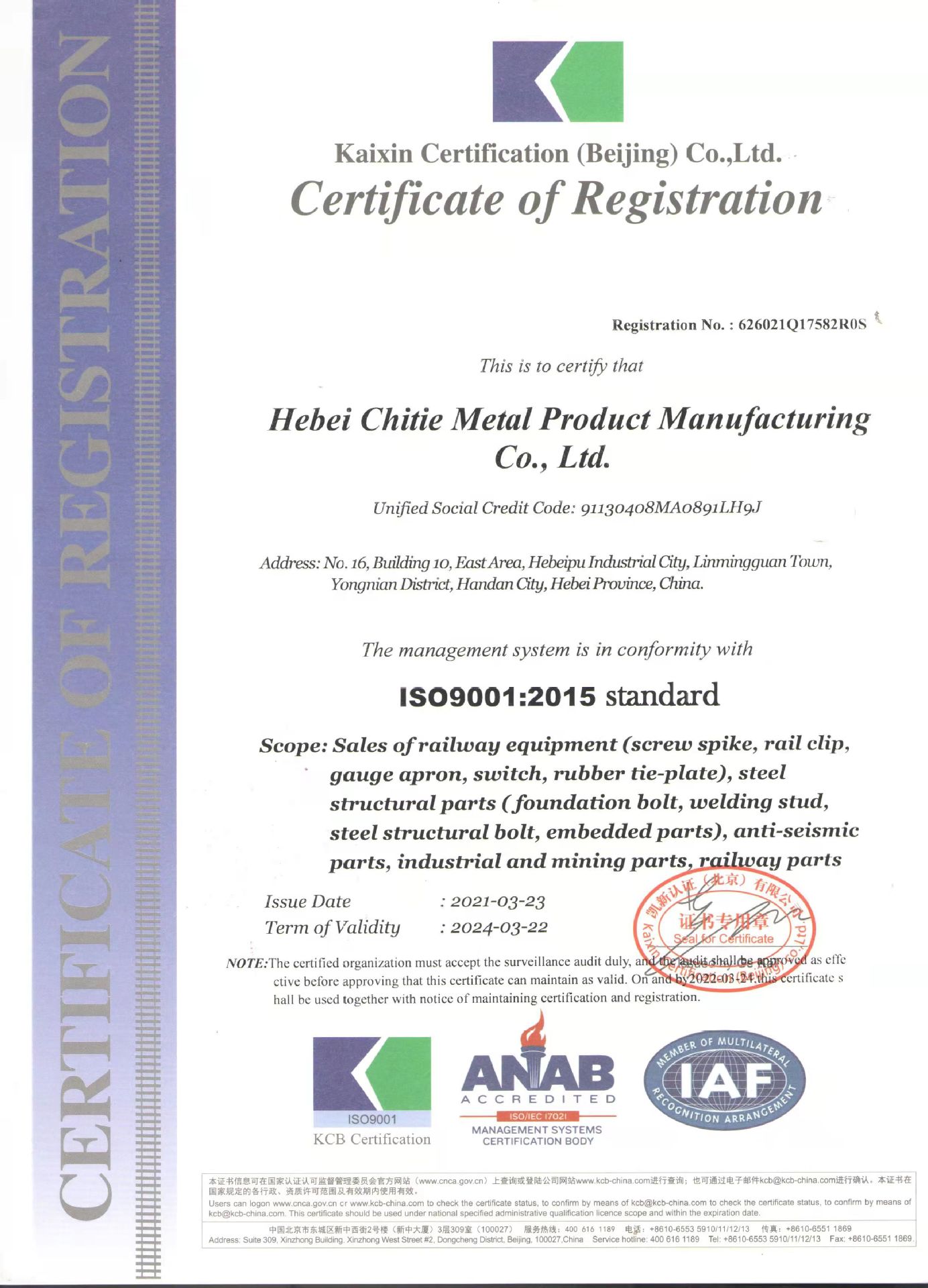 主要產(chǎn)品:鐵路配件、行車配件、工礦配件、魚尾板、道釘、壓軌器、軌道壓板、軌距拉桿、護(hù)軌扣板、T型螺栓、魚尾螺栓、彈條、軌距擋板